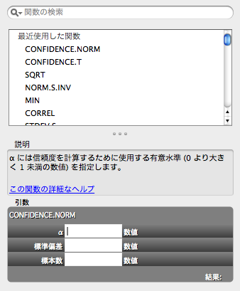 - メニューバーの「挿入」、「関数」の順に選択し、数式パレット(下図参照)を表示し、「統計」のところの「CONFIDENCE.NORM」をダブルクリックし、選択する。