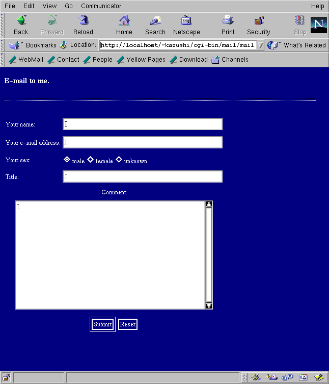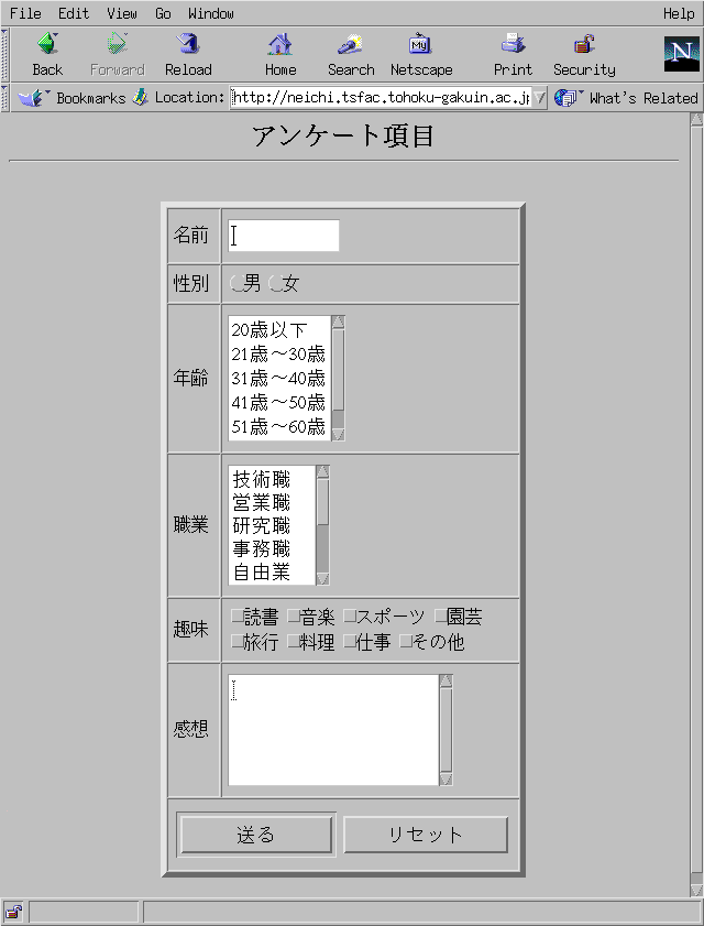 とします。TYPE="submit"として転送するためのボタンを用意します。VALUE="Submit"では、ボタンに書かれる文字を記述します。また、記述したすべての入力をリセットするためには、