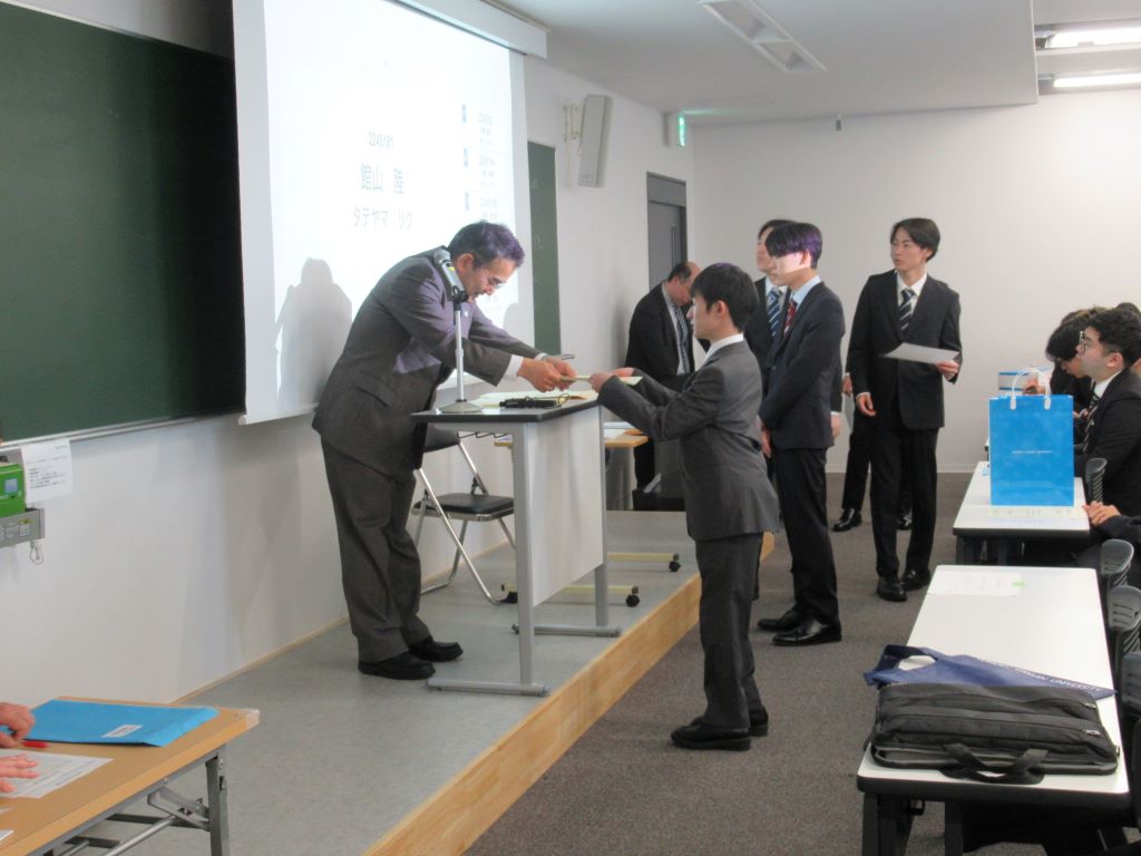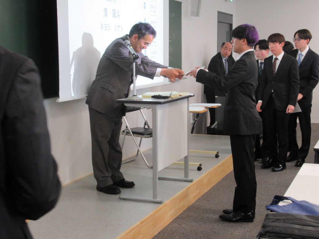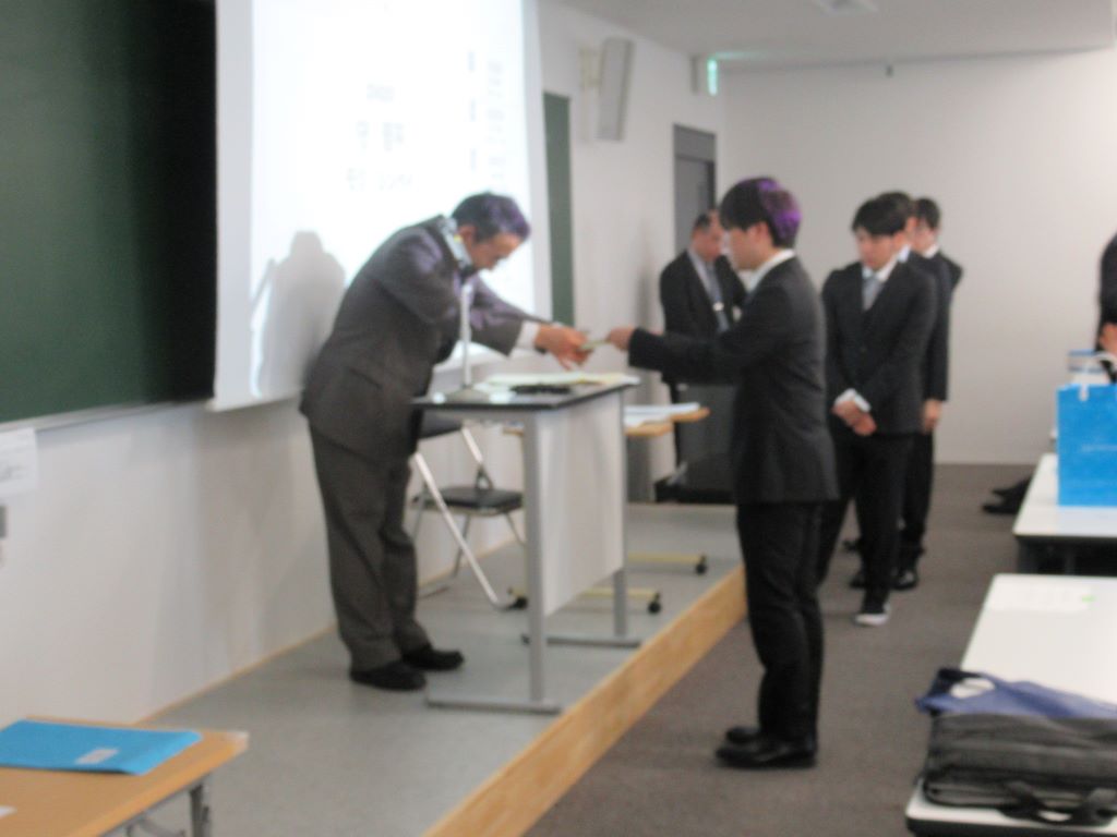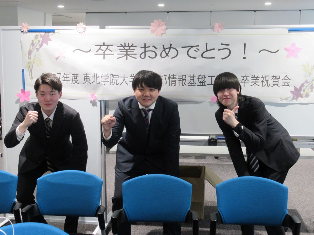 3月23日に卒業式が行われました.研究室の4年生8名が卒業しました.おめでとうございます.卒業式では,武田怜香さんが工学部の代表として卒業証書を受け取りました. また,武田さんと館山陸さんは東北学院大学卒業時学業成績優秀学生表彰も受賞しました.おめでとうございます.