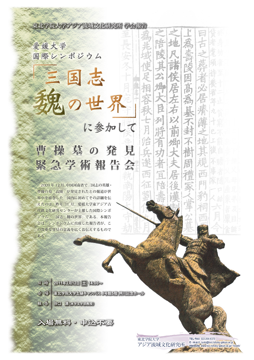- 2009年12月、中国河南省で三国志の英雄・曹操の墓「高陵」が発見されたとの報道が世界中を席巻した。国内に初めてその詳細を伝えたのは、昨年11月、愛媛大学東アジア古代鉄文化研究センター【ホームページ】が主催した国際シンポジウム『三国志 魏の世界』である。本報告会は、シンポジウムに出席した報告者が、この貴重な発見の意義を広くお伝えするものである。