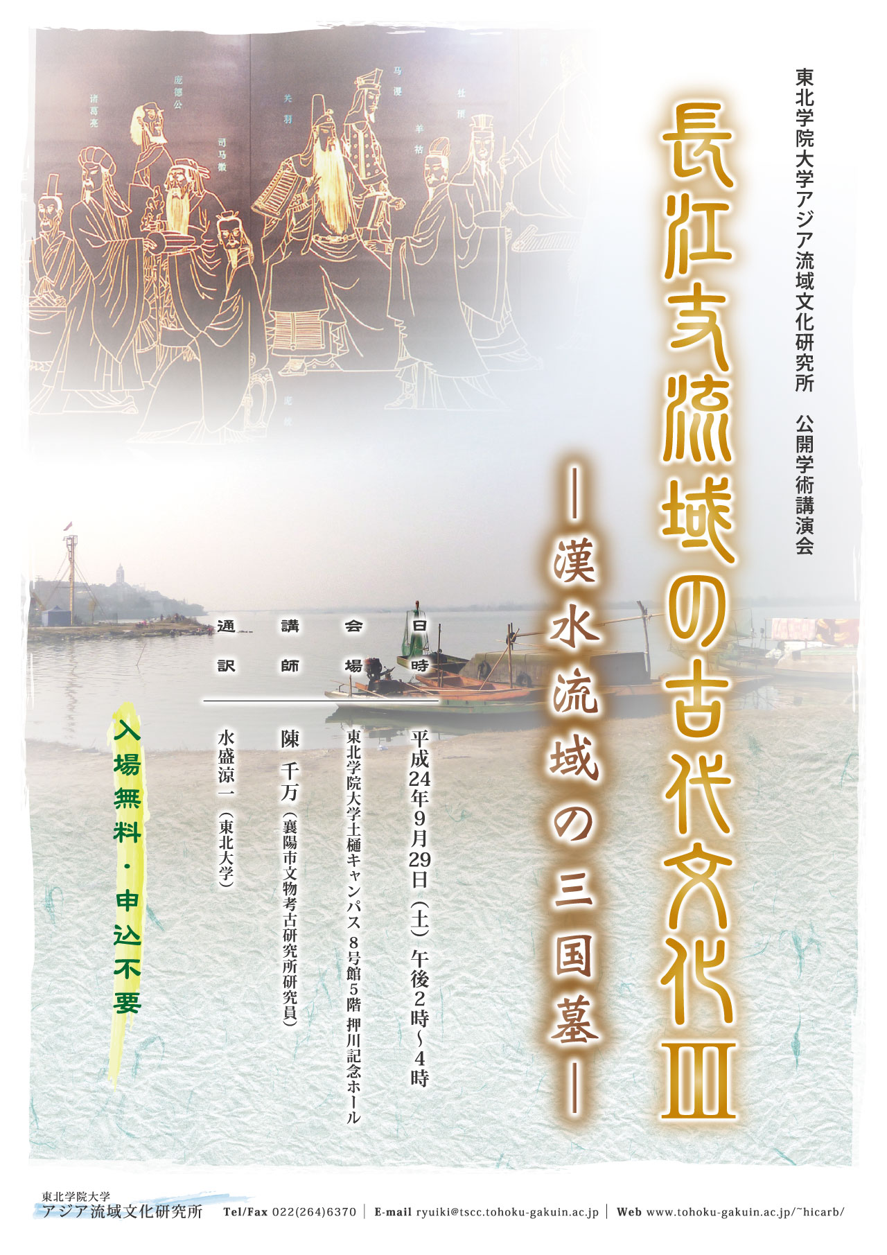 - アジア流域文化研究所では、オープン・リサーチ・センター整備事業「アジア流域文化論」研究プロジェクト以来、長江支流域の歴史文化の研究を継続してきており、すでに酉水・清江についての研究成果を公表している。そのような支流域研究の一つのまとめとして、最近話題を呼んでいる漢水流域の考古学文化についての公開講演会を開催するものである。
