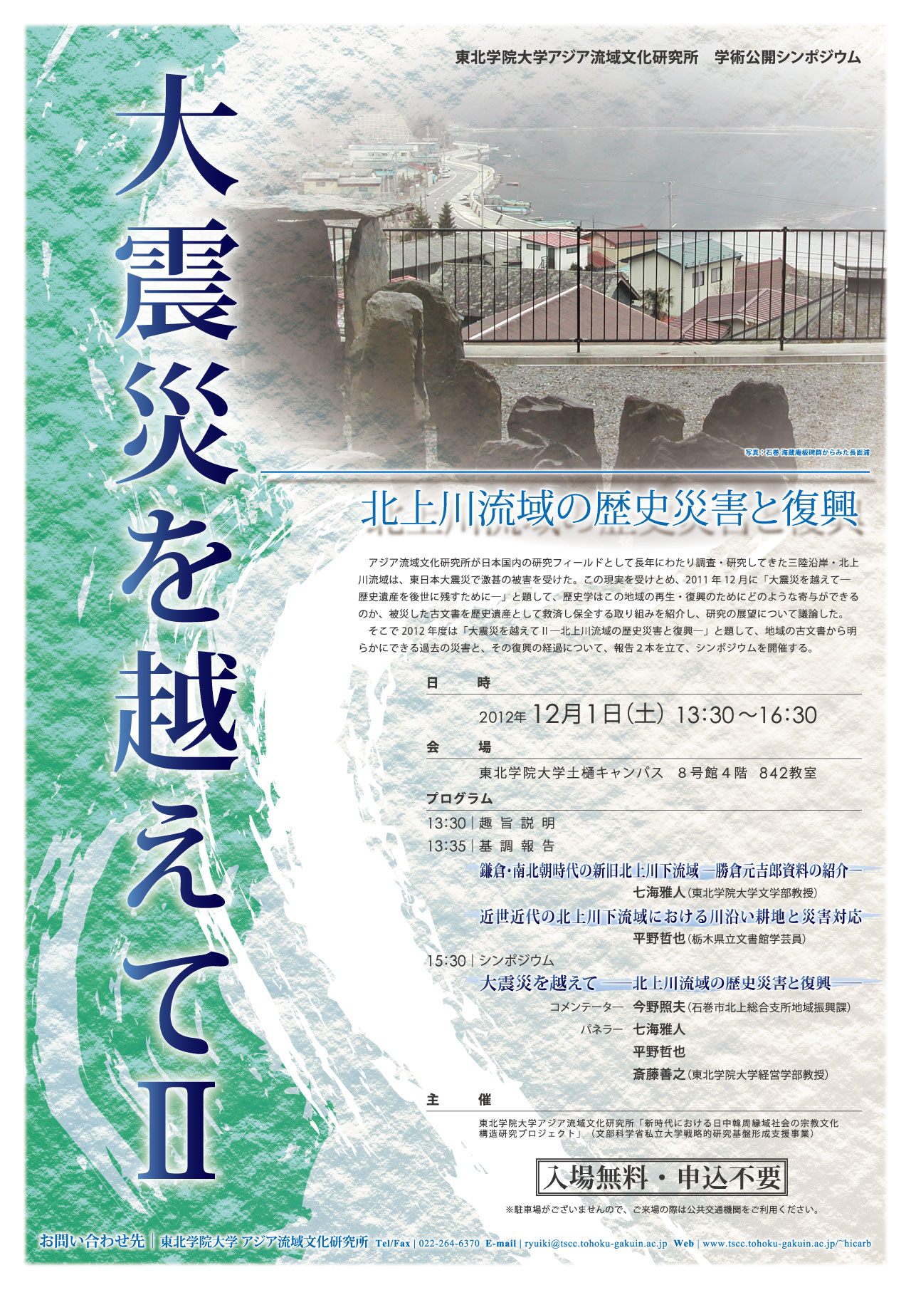 - アジア流域文化研究所が日本国内の研究フィールドとして長年にわたり調査・研究してきた三陸沿岸・北上川流域は、東日本大震災で激甚の被害を受けた。この現実を受けとめ、2011年12月に「大震災を越えて―歴史遺産を後世に残すために―」と題して、歴史学はこの地域の再生・復興のためにどのような寄与ができるのか、被災した古文書を歴史遺産として救済し保全する取り組みを紹介し、研究の展望について議論した。