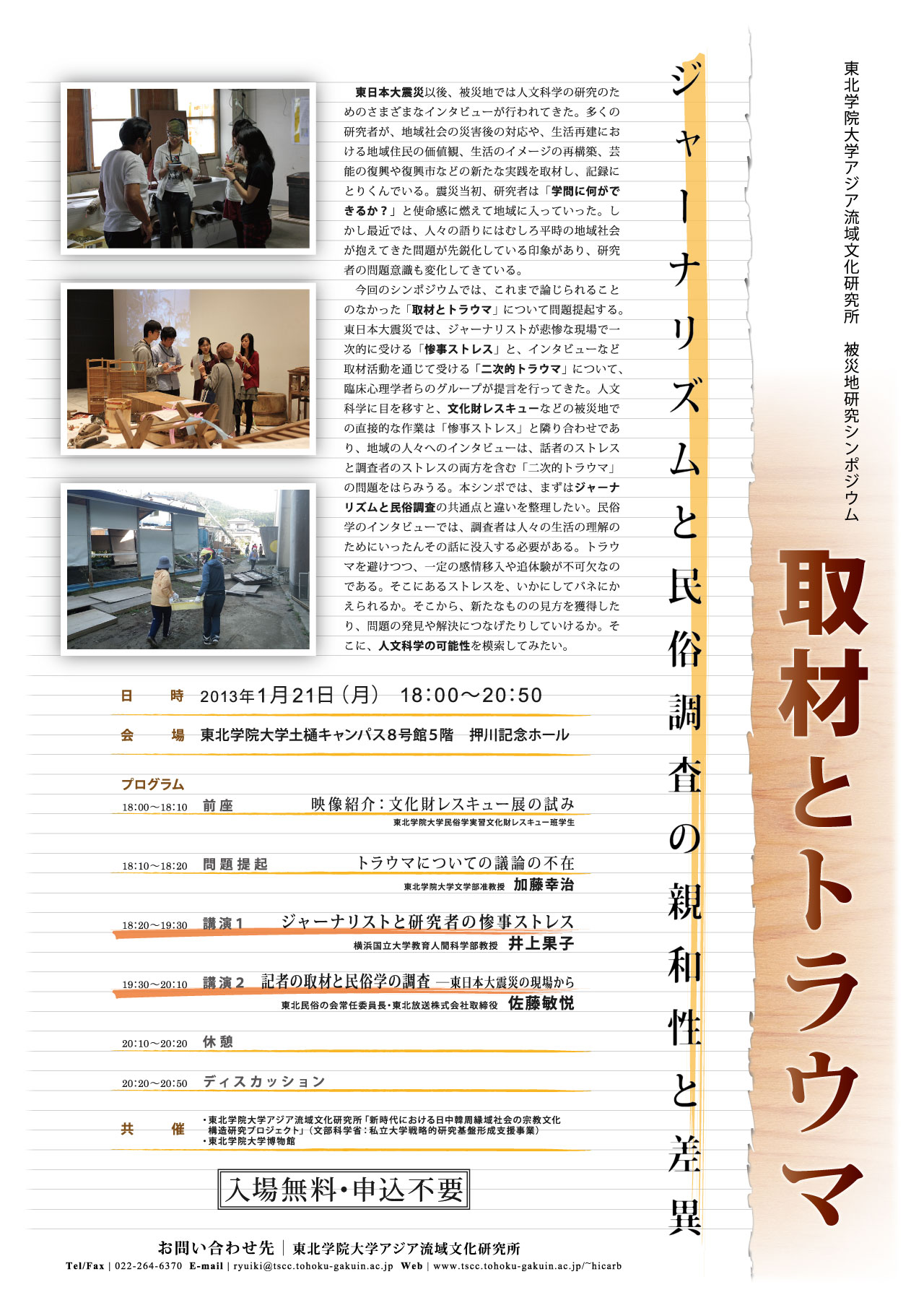 人文科学に目を移すと、文化財レスキューなどの被災地での直接的な作業は「惨事ストレス」と隣り合わせであり、地域の人々へのインタビューは、話者のストレスと調査者のストレスの両方を含む「二次的トラウマ」の問題をはらみうる。本シンポでは、まずはジャーナリズムと民俗調査の共通点と違いを整理したい。