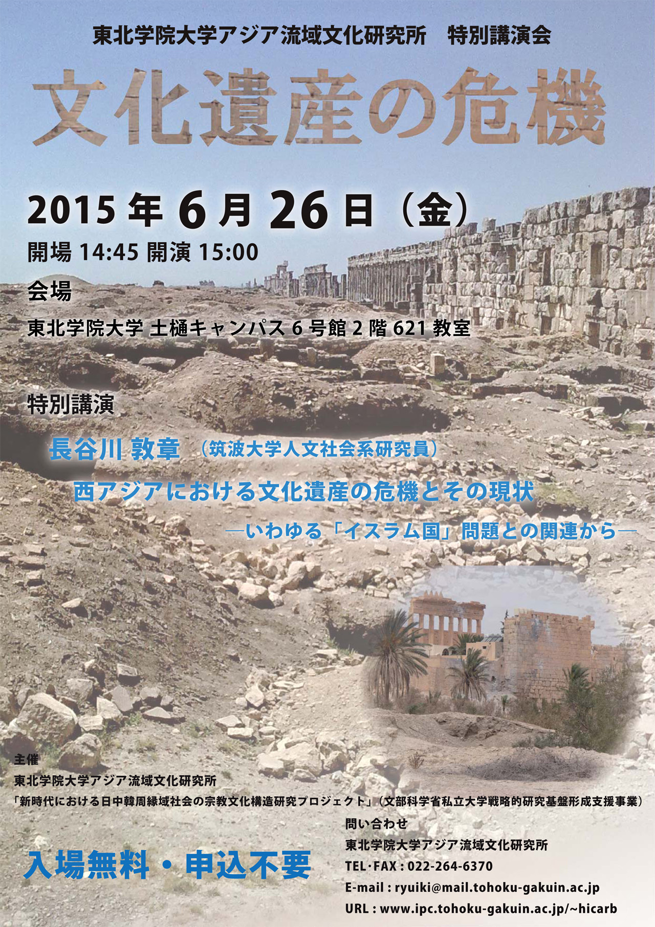 - 特別講演「西アジアにおける文化遺産の危機とその現状―いわゆる「イスラム国」問題との関連から―」